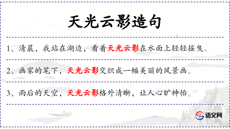 - 天光云影:名词短语,形容天空的光线和云彩的影子。