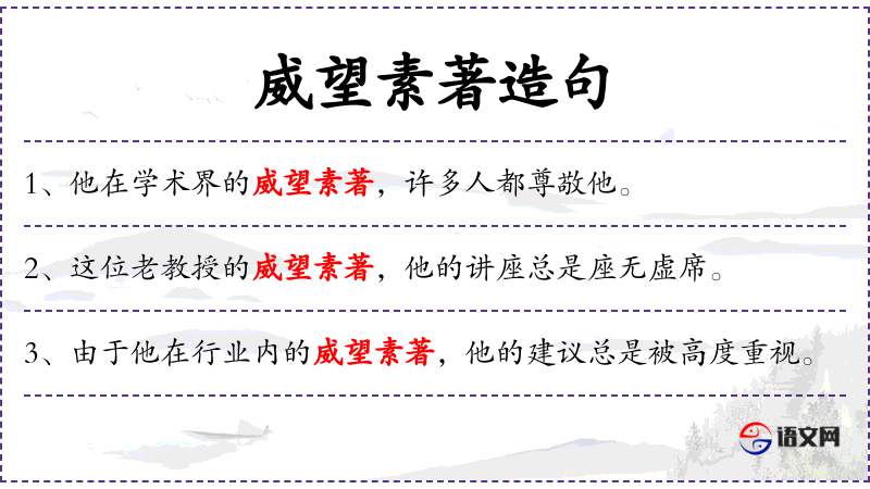 1. 【威望素著】 威望:威信,声望;素:一向;著:明显。一向很有威望。