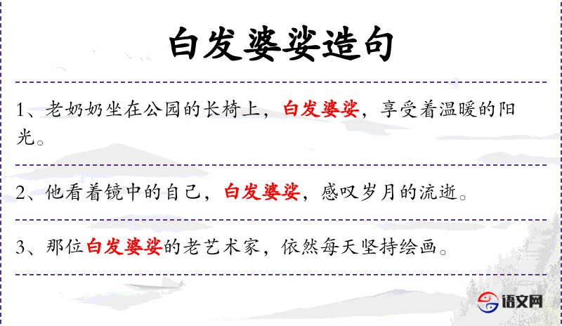 2. 【白发婆娑】 - 婆娑:纷披的样子。形容满头白发的老年人的样子。