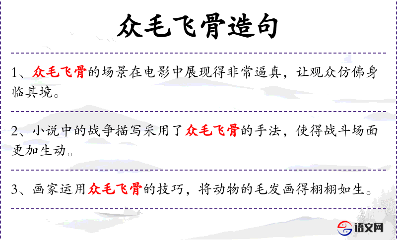 - “画家通过众毛飞骨的技巧,成功地将动物的毛发描绘得栩栩如生。”