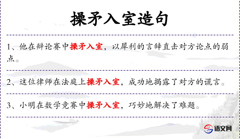 5. 【操矛入室】 比喻深入了解对方,找出其纰漏,又以对方的论点来批驳对方。