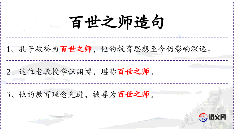 3. 【百世之师】 - 世世代代的老师,指才德高尚而永远可为人师表的人。