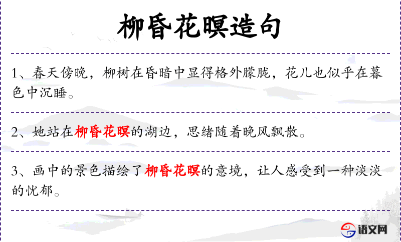1. 【柳昏花暝】 - 暝:日暮。形容暮色中花柳的朦胧景象。