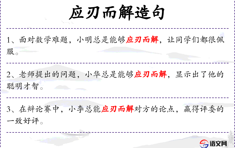 - 状语:在编程比赛中,面对复杂的算法问题,总是能够应刃而解