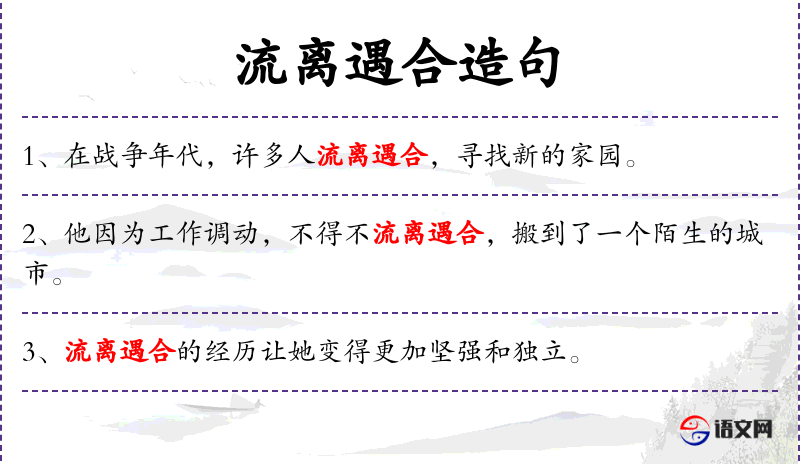 1. 【流离遇合】 - 流离:流转,离散;遇合:指遇到赏识自己的人。流离失所又再团聚。