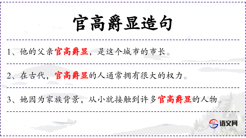 - 官高爵显:形容词短语,形容政治地位高,荣誉显赫。