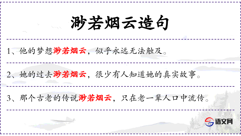 4. 【渺若烟云】 - 渺:渺茫;若:象。象烟云一样渺茫不清。比喻模糊不清,令人捉摸不定。