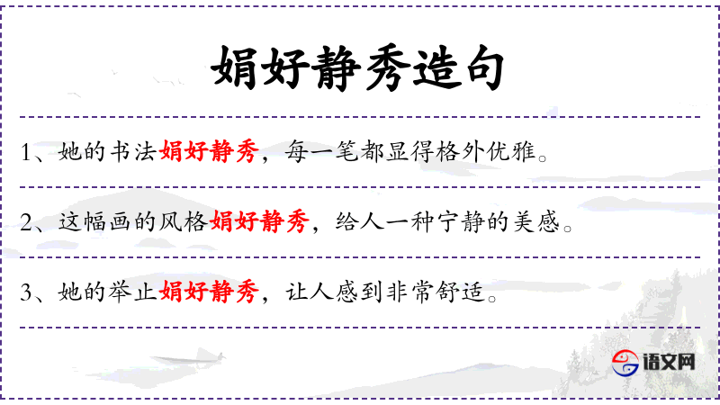 - 娟好静秀:形容诗句优美、文静、秀丽。
