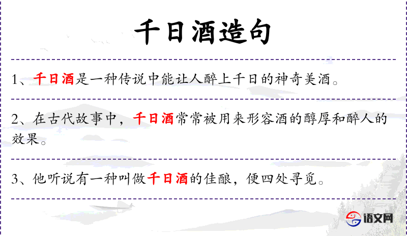 - 千日酒:可能指的是一种传说中的酒,具有特殊的意义或效果。
