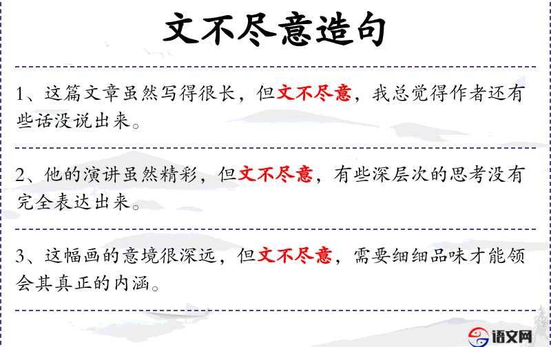 - 文不尽意:指文章表达的意思不完全,留有空间让读者去思考和解读。