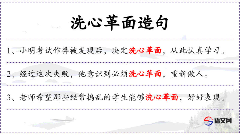 4. 【洗心革面】 - 清除旧思想,改变旧面貌。比喻彻底悔改。