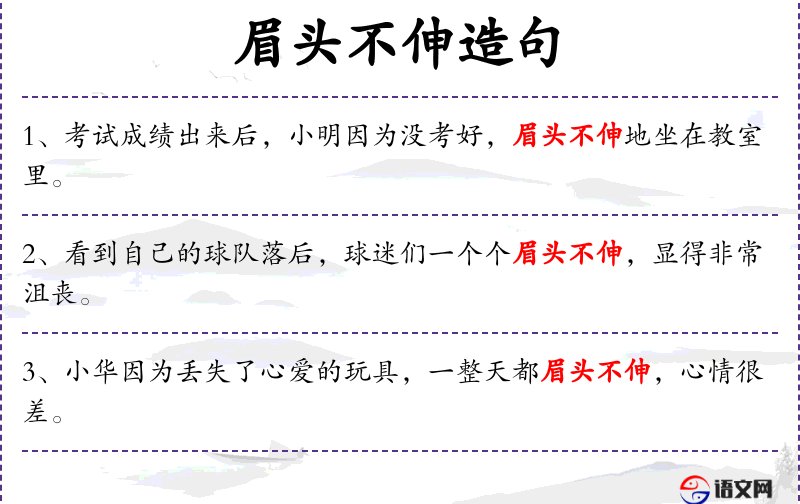 4. 【眉头不伸】 - 形容忧愁烦闷的样子。