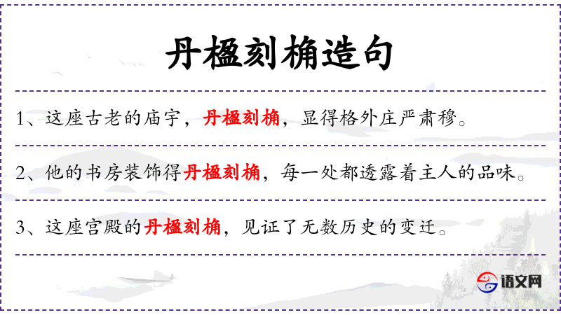 - 丹楹刻桷:形容建筑装饰华丽,“丹”指红色,“楹”指柱子,“刻桷”指雕刻的屋檐。
