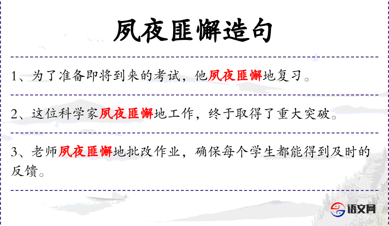 - 夙夜匪懈:形容日夜不停地努力,不懈怠。