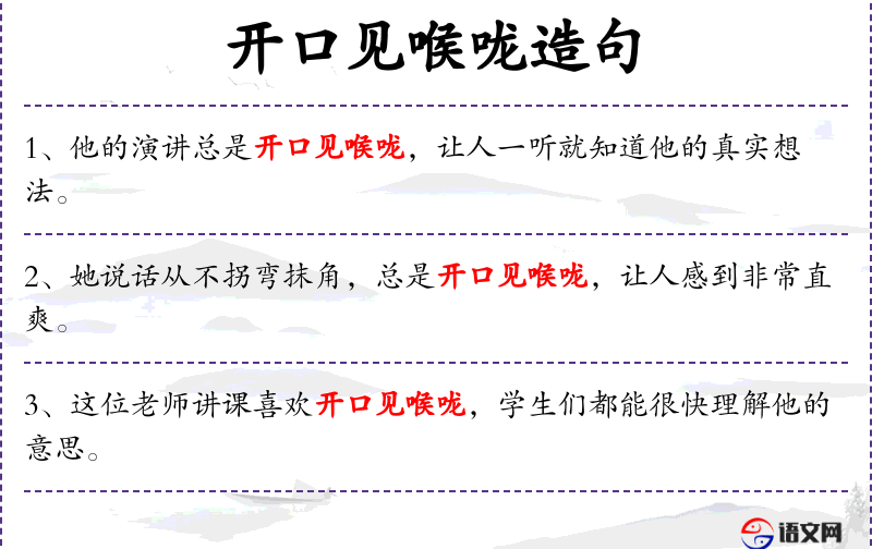 - 文化意义:“开口见喉咙”这个表达在**文化中常用来形容说话直率,不绕弯子,这与西方文化中的“speak one's mind”类似。