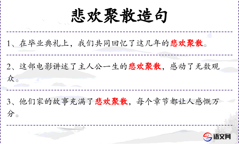 - 悲欢聚散:名词短语,表示生活中的各种情感和人际关系的变迁。