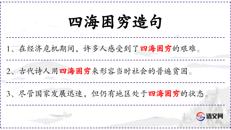 - 古代诗人用“四海困穷”这一成语来描述当时社会的普遍贫困状况。