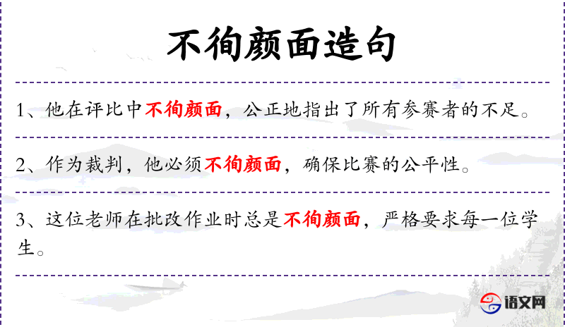 1. 【不徇颜面】 徇:曲从,偏私;颜面:面容,脸色。不曲从于别人的脸色。指不看别人的脸色行事。
