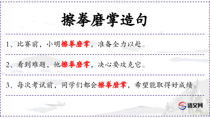 - 面对即将到来的比赛,小明擦拳磨掌,准备尽其所能。