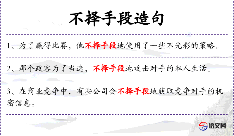 1. 【不择手段】 - 择:选择。指为了达到目的,什么手段都使得出来。