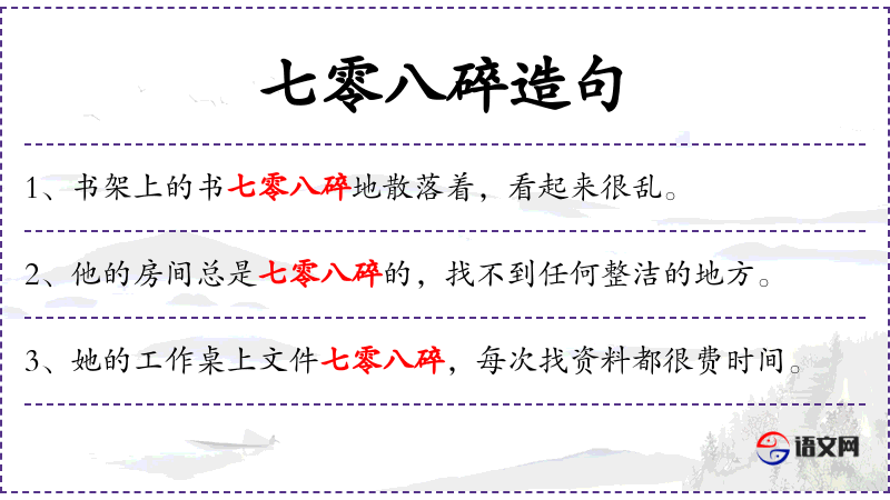 - 宾语:无明确宾语,因为“七零八碎”是形容词短语,描述主语的状态。