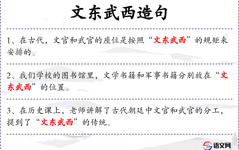- 文东武西:一种古代官场中的办公区域划分方式,文官在东,武官在西。