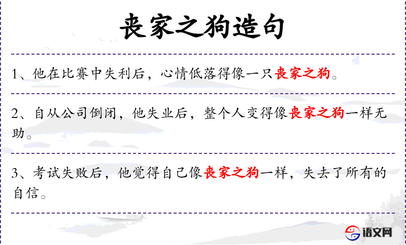 - 文化背景中,“丧家之狗”是一个带有贬义的比喻,常用于形容人的失意和无助。