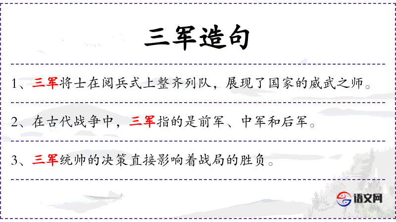 1. 【三军】 我国古代指上、中、下三军,左、中、右三军,或步、车、骑三军;指陆军、海军、空军;对军队的统称。