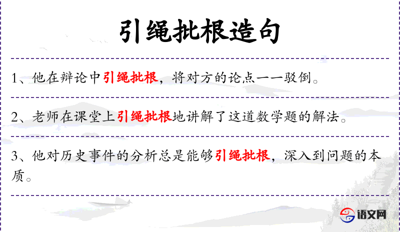 - 引绳批根:这是一个成语,意思是抓住问题的根本,直接针对问题的根源进行处理。