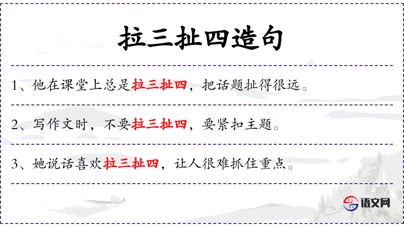 - 拉三扯四:拖泥带水、绕弯子、东拉西扯