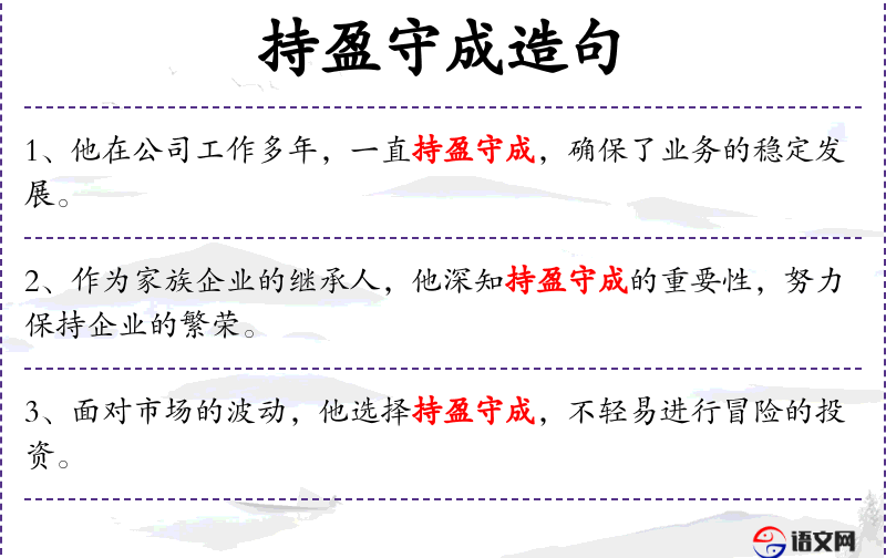 句子:“面对市场的波动,他选择持盈守成,不轻易进行冒险的投资。”