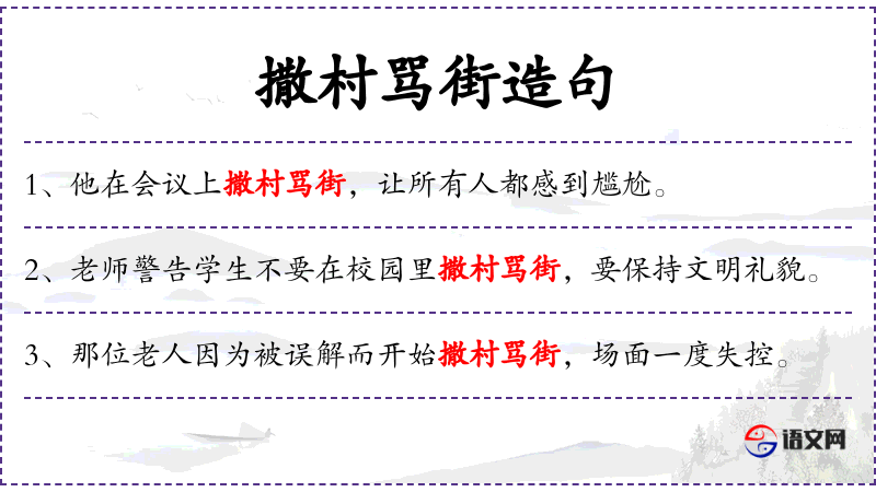 - 撒村骂街:动词短语,形容在公共场合大声辱骂,通常带有贬义。