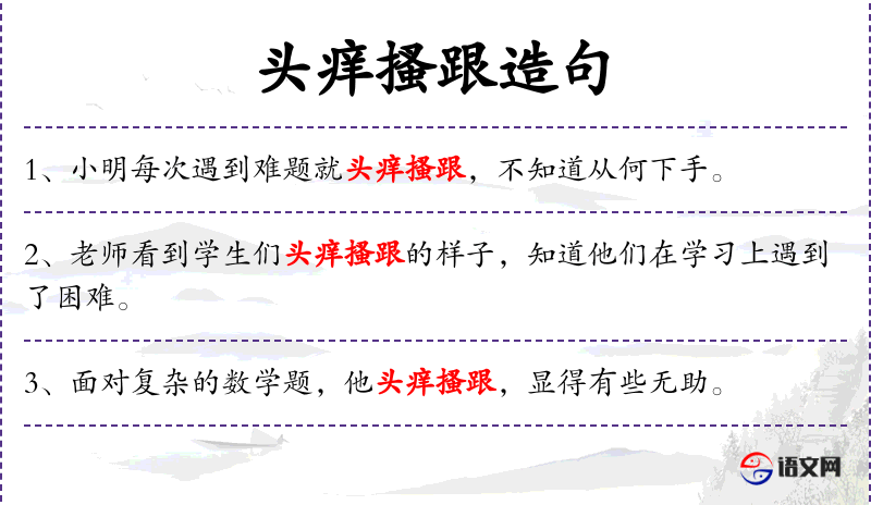 句子:“考试时,有些题目让同学们头痒搔跟,不知如何解答。”