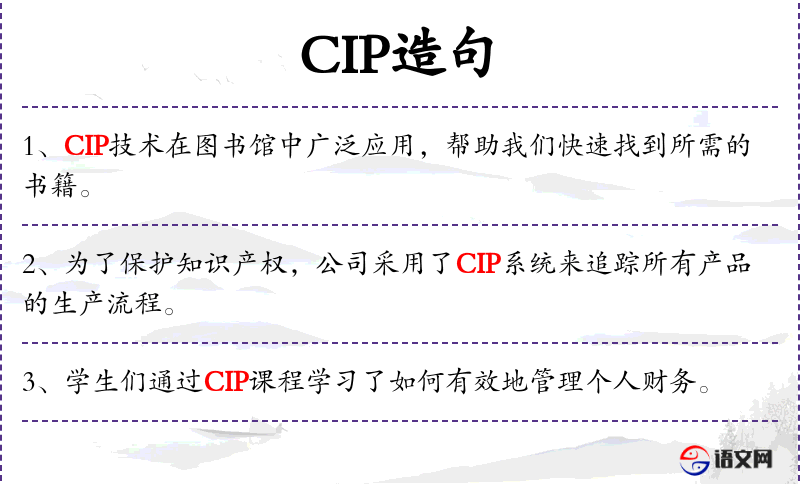 1. 【CIP】 在版编目;预编目录。在图书出版前,由图书编目部门根据出版商提供的校样先行编目,编目后将著录内容及标准格式交出版机构,将它印于图书的版权页上。