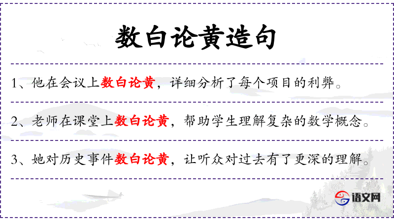 - 数白论黄:这是一个成语,意指辩论时能够清晰、有力地陈述观点,通常用于形容辩论技巧高超。