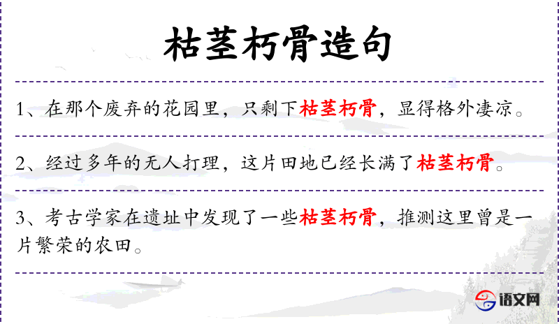 3. 【枯茎朽骨】 - 茎:草茎;骨:骨头。枯槁的草茎,腐烂的骨头。比喻腐朽的事物。