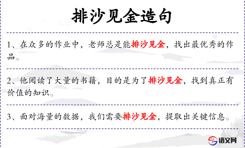 句子:“在众多的作业中,老师总是能排沙见金,找出最优秀的作品。”