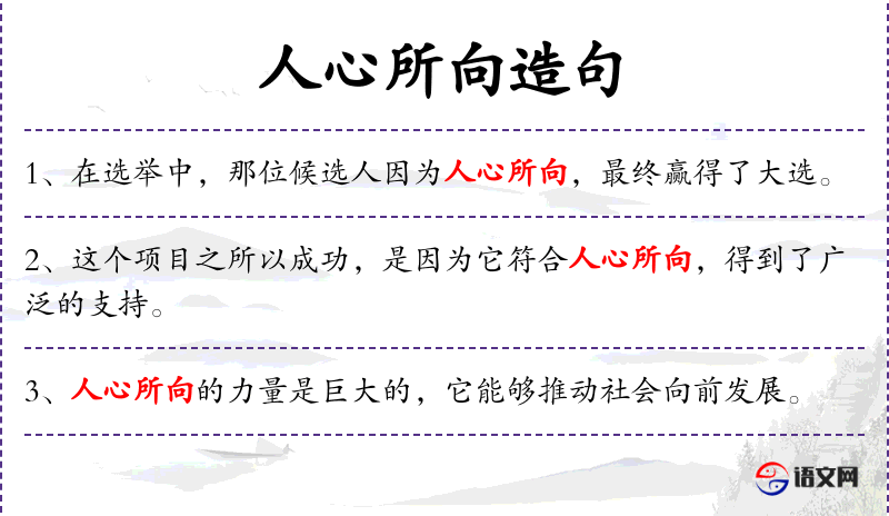 1. 【人心所向】 向:归向,向往。指人民群众所拥护的,向往的。