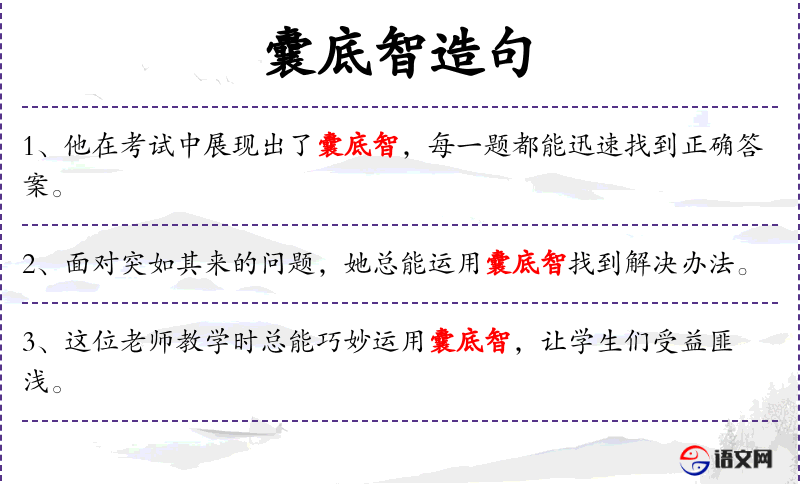 - 囊底智:成语,源自**传统文化,意为极高的智慧。