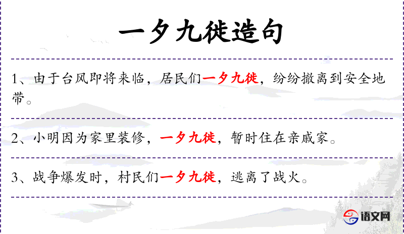 1. 【一夕九徙】 九:多次;徙:迁移。一夜之间迁移好几次。形容居住的地方极不安全。