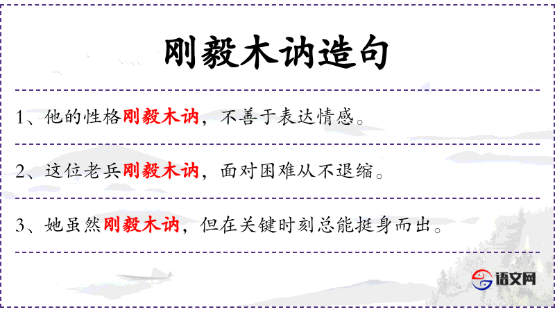 2. 【刚毅木讷】 刚:坚强;毅:果决;木:质朴;讷:说话迟钝,此处指言语谨慎。孔子称颂人的四种品质。