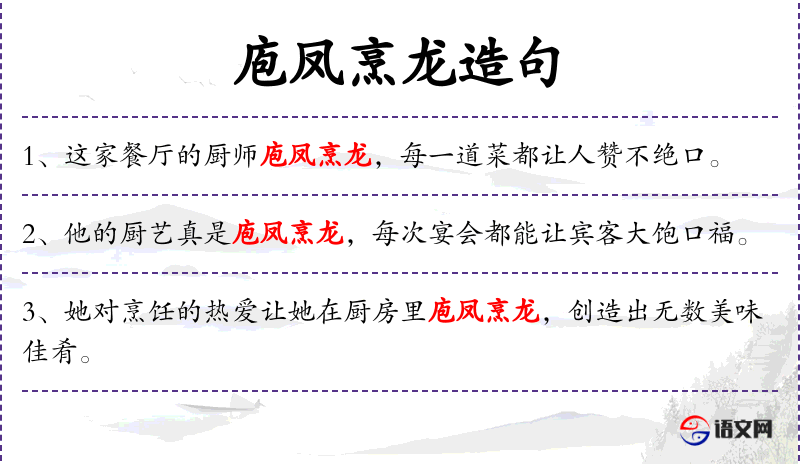 - 庖凤烹龙:这是一个成语,形容厨师技艺高超,烹饪出的菜肴非常美味。