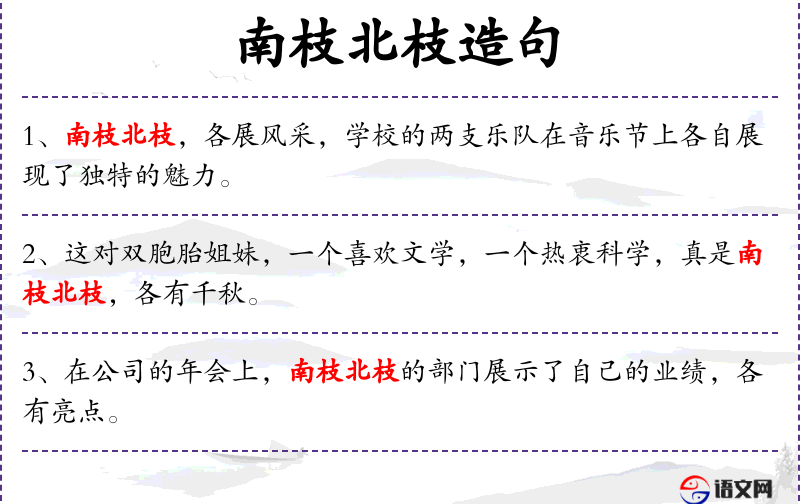 - 南枝北枝:成语,比喻各有特长或各有发展方向。