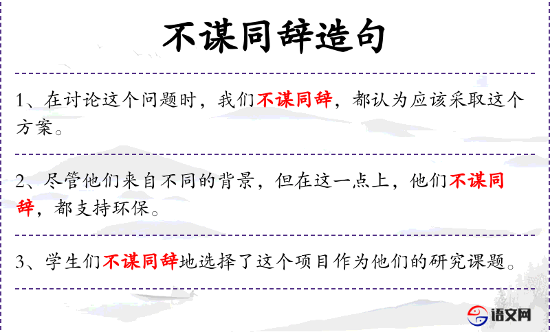 1. 【不谋同辞】 指事前没有商量而意见完全一致。