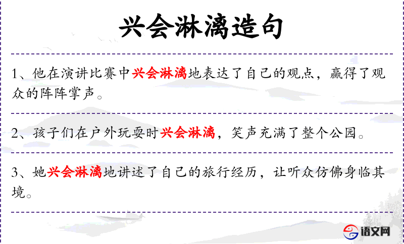 - 兴会淋漓:形容非常兴奋和投入。