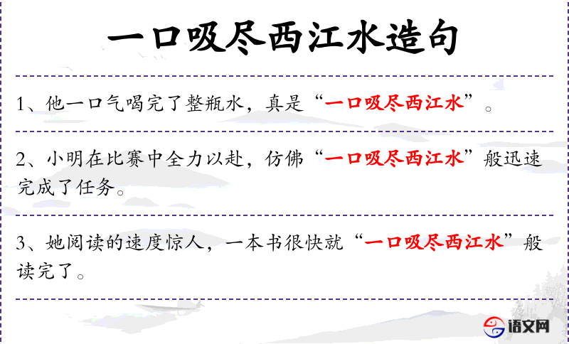 - 文化背景中,成语“一口吸尽西江水”常用来形容做事迅速、彻底,这里用来夸张地描述小华完成作业的速度和彻底性。