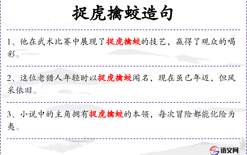 - 捉虎擒蛟:这是一个成语,形容技艺高超,能够制服强大的对手。