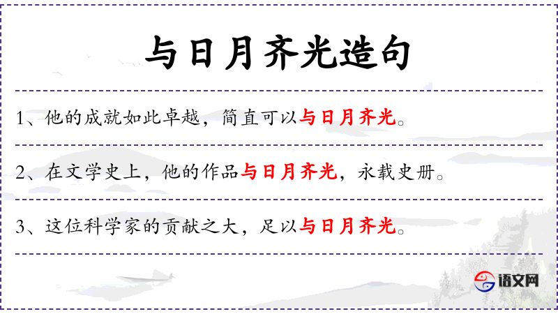 1. 【与日月齐光】 - 与太阳、月亮的光芒相当。常用以称赞人的精神、功业伟大。
