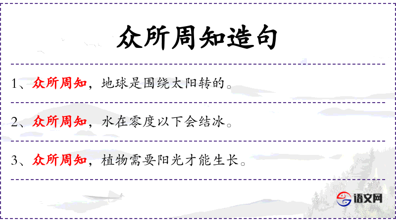- 众所周知:表示某事是大家普遍知道的,常用作句子的状语。