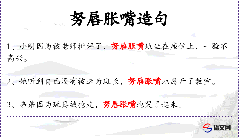 - 状语:因为玩具被抢走,努唇胀嘴地